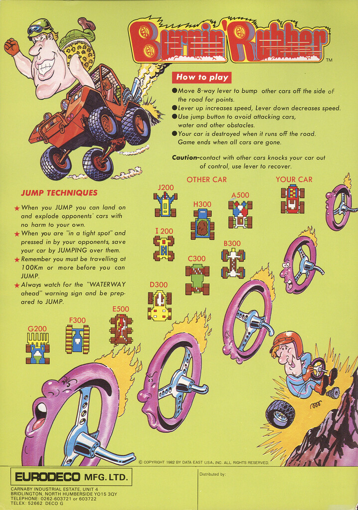 Burnin’ Rubber UncategorizedApril 2023July 2023 Dan Hower Year Released 1982 Developed by Data East Published by EuroDECO Mfg. More Information DECO Cassette System Also known as Bump’n Jump. Printed Text English Paper Size A4 Date Posted Apr 8, 2023 Views 1