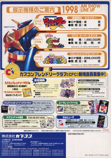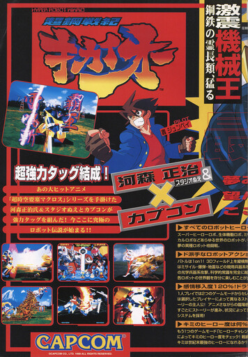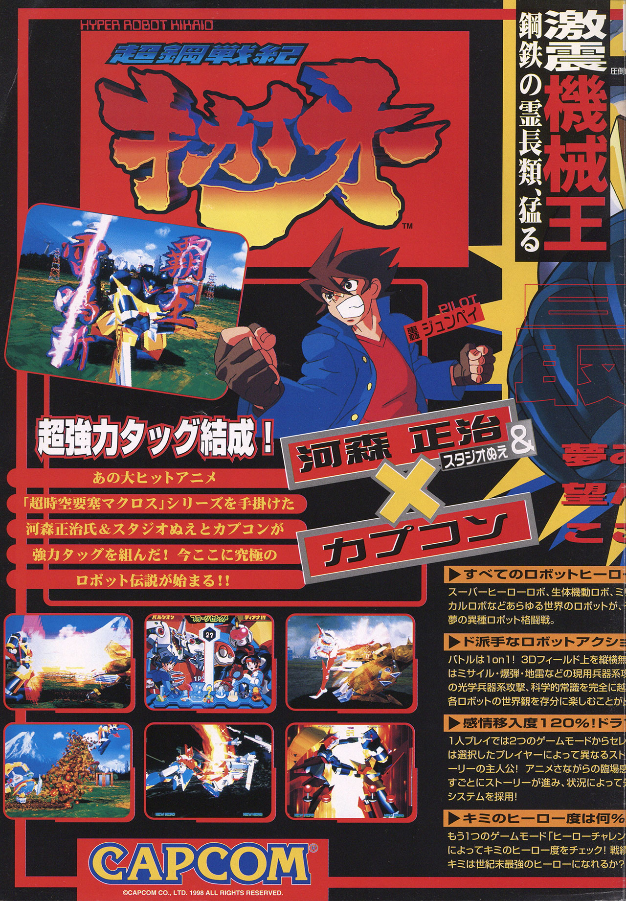 Capcom 1998 Amusement Machine Show Line Up UncategorizedFebruary 2023July 2023 Dan Hower Year Released 1998 Developed by Capcom Published by Capcom More Information Video Games Catalog Shows Tyoukousenki Kikaioh. Also known as Tech Romancer. Printed Text Japanese Paper Size A4 Date Posted Feb 6, 2023 Views 1