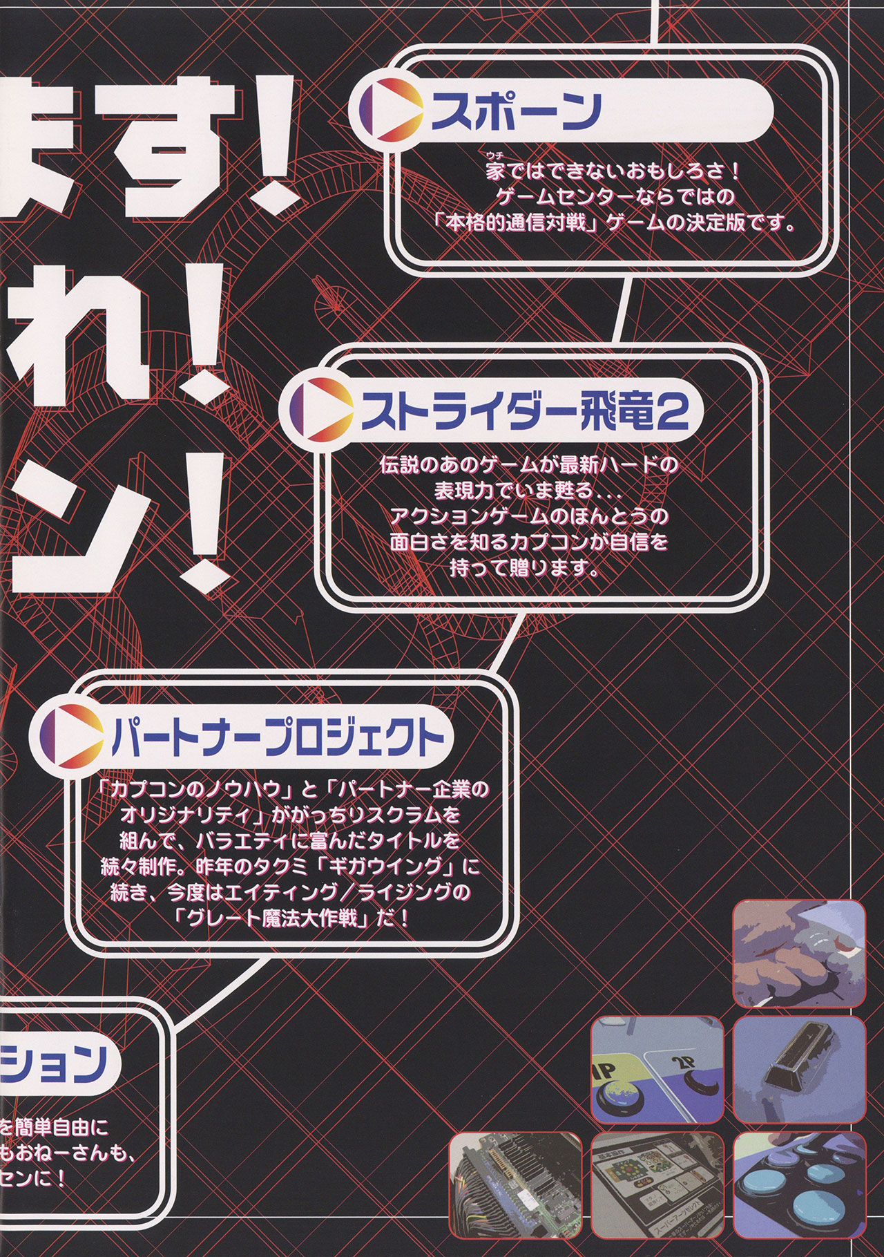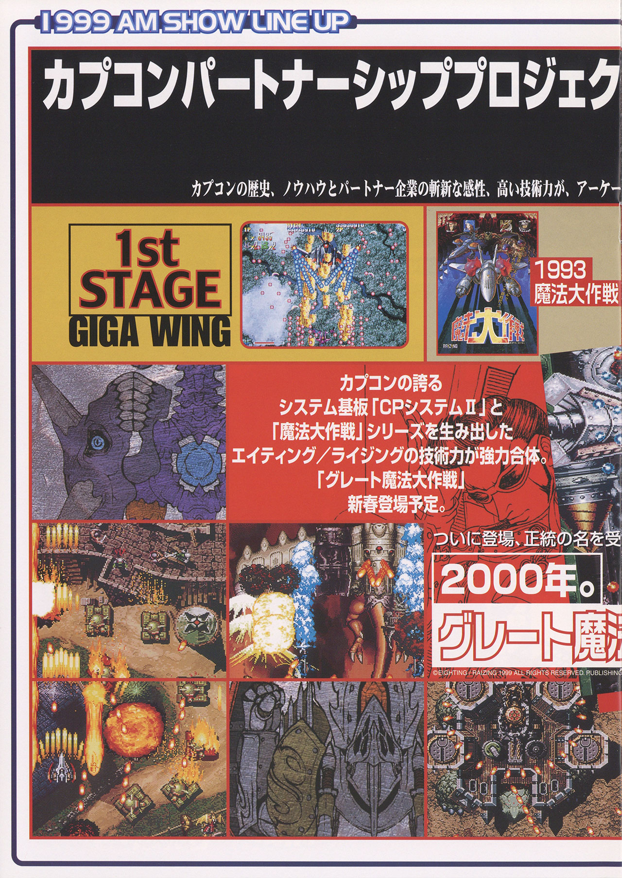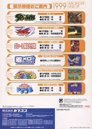 Capcom 1999 Amusement Machine Show Line Up Catalog UncategorizedJune 2024June 2024 Dan Hower Year Released 1999 Developed by Capcom Published by Capcom More Information Video Games Catalog Shows Spawn: In The Demon’s Hand, Strider Hiryu 2, and GigaWing. Printed Text Japanese Paper Size A4 Date Posted Jun 25, 2024 Views 8