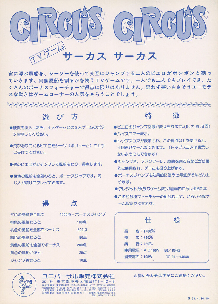 Circus Circus UncategorizedOctober 2023July 2024 Dan Hower Year Released 1978 Developed by Universal Published by Universal More Information Clone of Circus by Exidy Printed Text Japanese Paper Size Large Format Date Posted Oct 20, 2023 Views 1