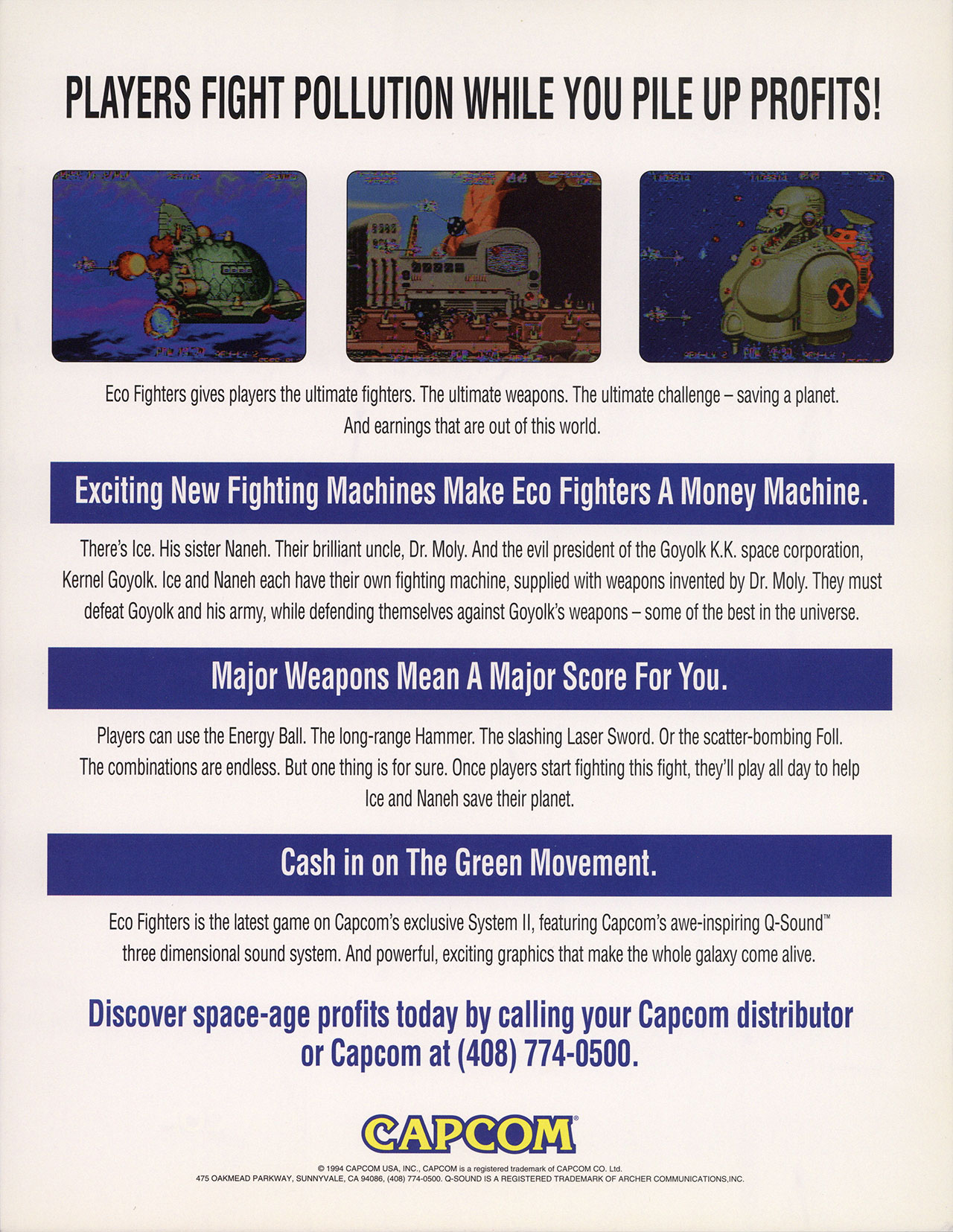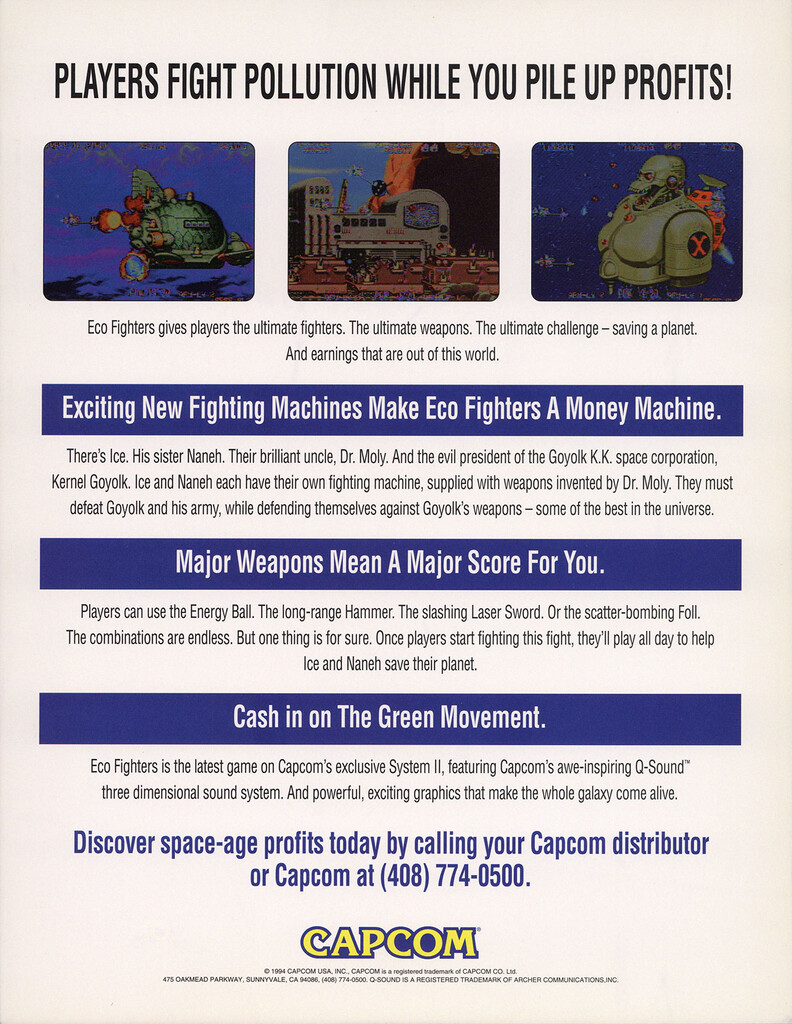 Eco Fighters UncategorizedNovember 2023January 2024 Dan Hower Year Released 1993 Developed by Capcom Published by Capcom More Information Also known as Ultimate Ecology. Printed Text English Paper Size US Letter Date Posted Nov 30, 2023 Views 0