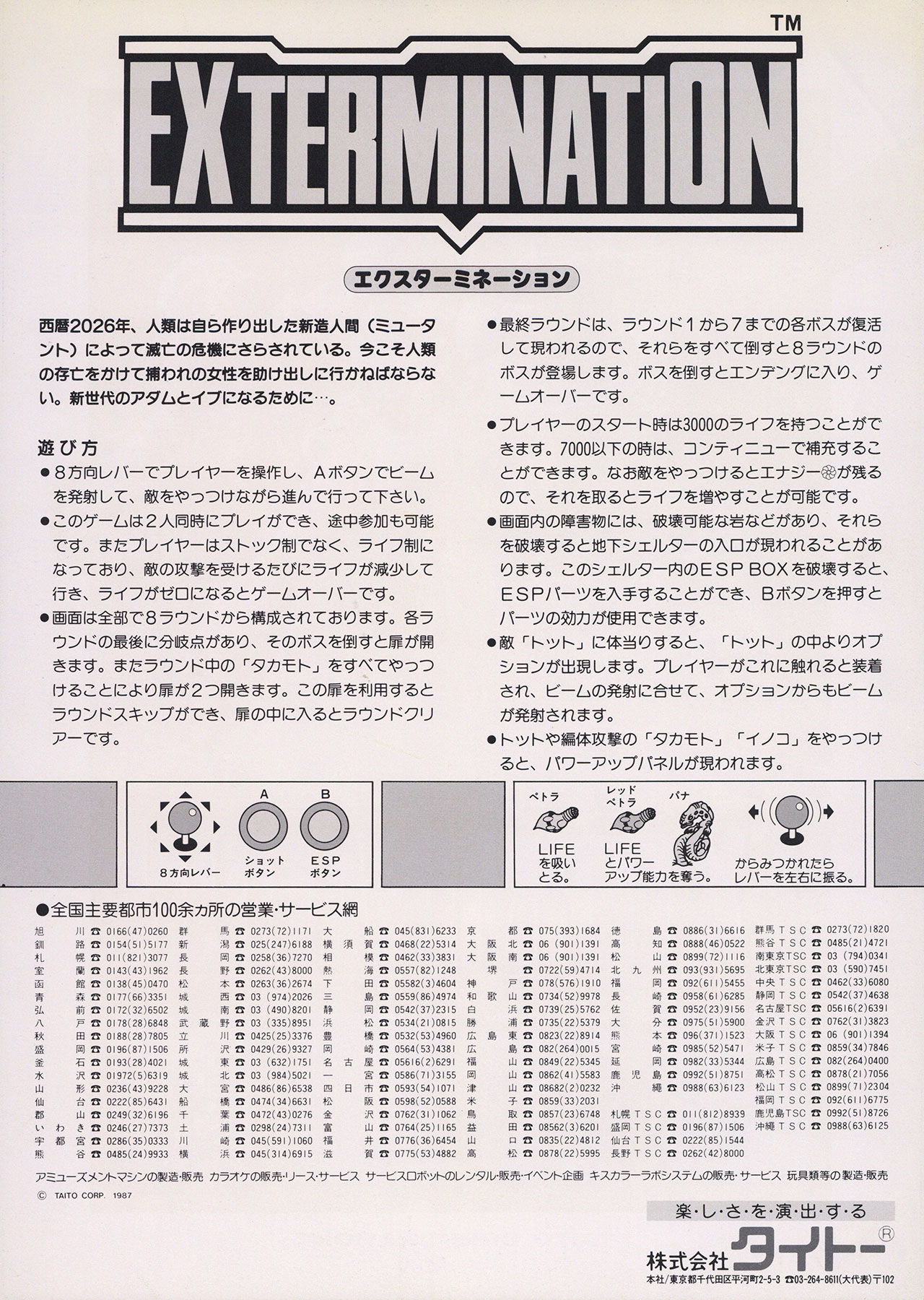 Extermination UncategorizedNovember 2021July 2023 Dan Hower Year Released 1987 Developed by Taito Published by Taito More Information Printed Text Japanese Paper Size A4 Date Posted Nov 1, 2021 Views 6