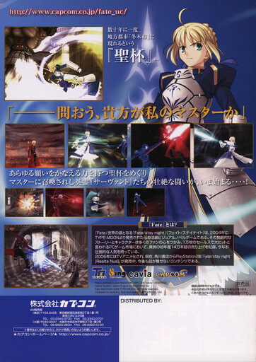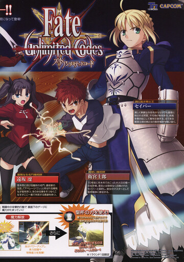 Fate: Unlimited Codes UncategorizedMarch 2023July 2023 Dan Hower Year Released 2008 Developed by Eighting, Type-Moon Published by Capcom More Information Printed Text Japanese Paper Size A4 Date Posted Mar 11, 2023 Views 0
