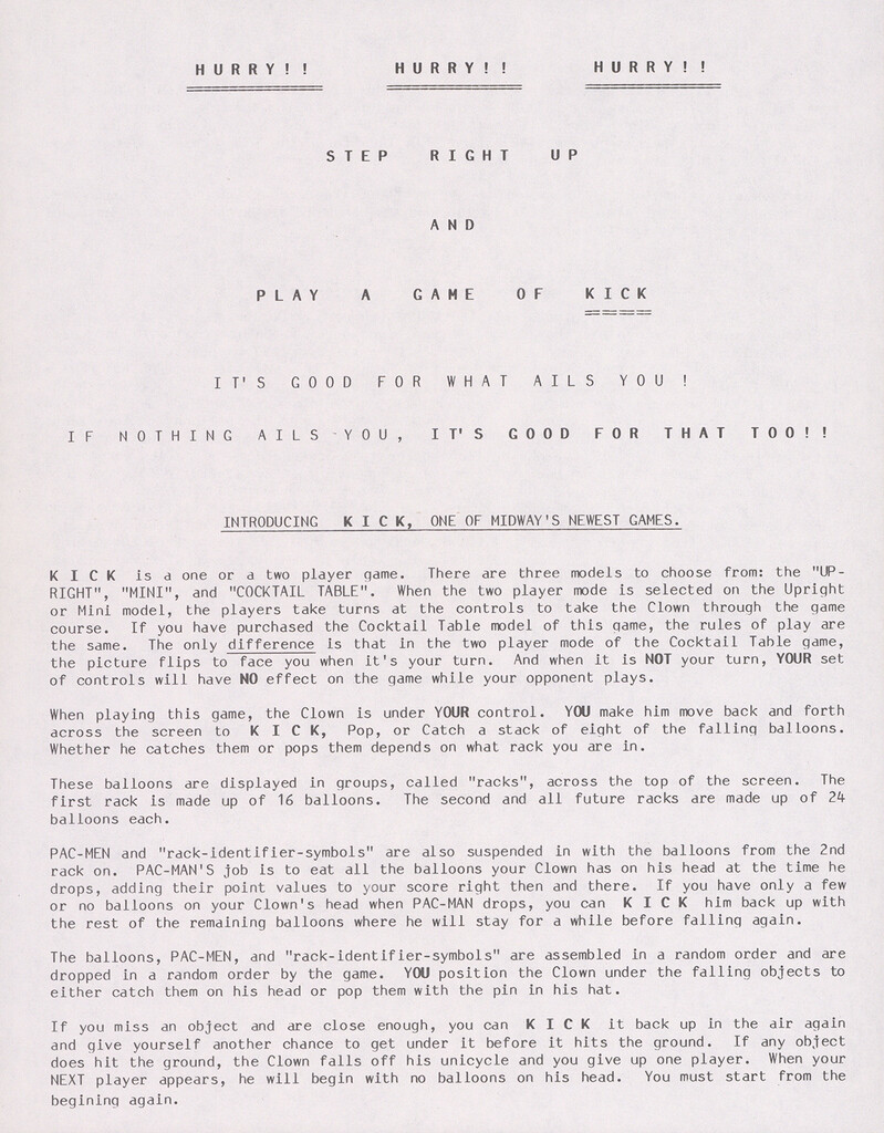 Kick UncategorizedDecember 2024December 2024 Dan Hower Year Released 1981 Developed by Midway Published by Midway More Information Also known as Kick Man Printed Text English Paper Size US Letter Date Posted Dec 1, 2024 Views 3