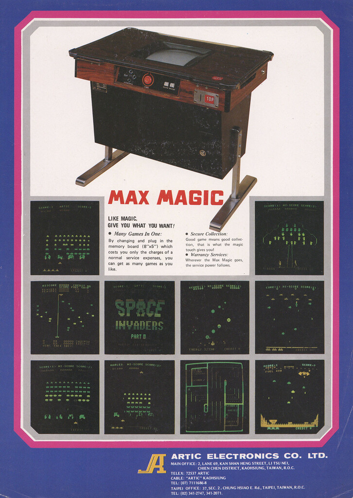 Shows clones of Galaxy Wars by Universal, Lunar Rescue by Taito, Moon Base Zeta by Nichibutsu, Ozma Wars by SNK, Rolling Crash by Nichibutsu, Space Invaders Part II by Taito, Space Laser by Taito, Space War by Sanritsu, and Yosaku To Donbei by Wing.