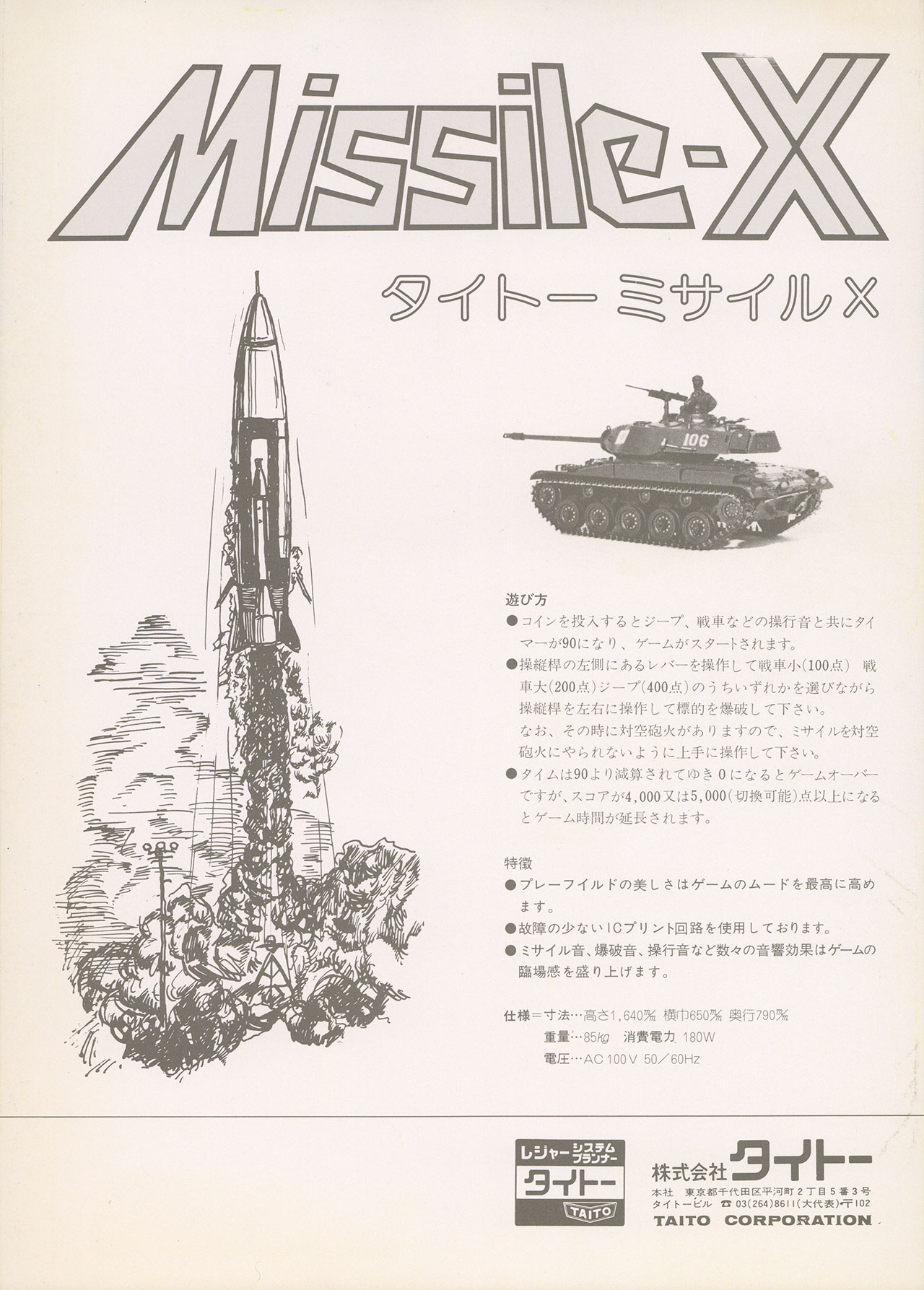Missile-X UncategorizedOctober 2023October 2023 Dan Hower Year Released 1977 Developed by Taito Published by Taito More Information Also known as Guided Missile. Printed Text Japanese Paper Size A4 Date Posted Oct 20, 2023 Views 2