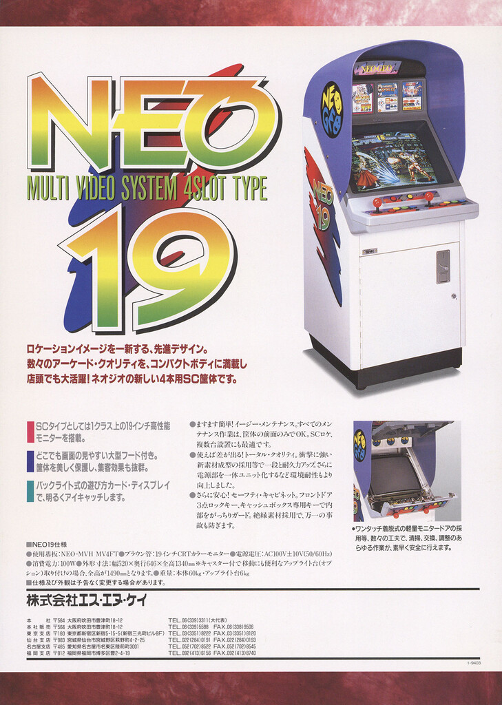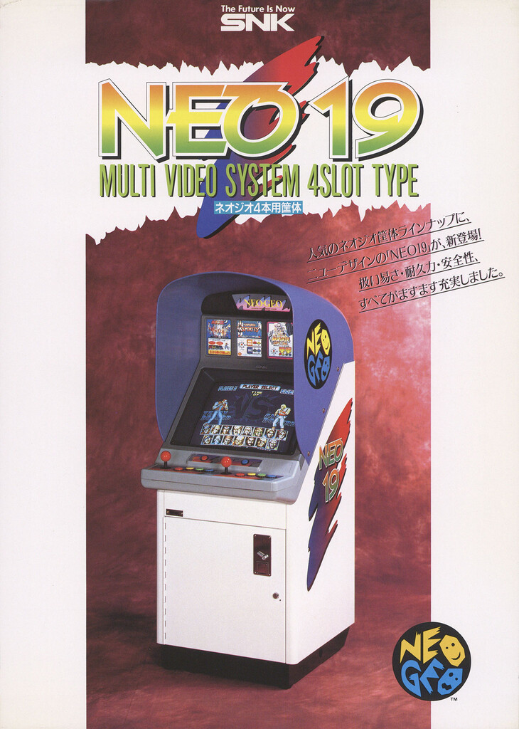 Neo Geo MVS Neo-19 4Slot Type Cabinet UncategorizedJune 2024June 2024 Dan Hower Year Released 1994 Developed by SNK Published by SNK More Information Shows Fatal Fury Special and Samurai Spirits. Printed Text Japanese Paper Size A4 Date Posted Jun 15, 2024 Views 0