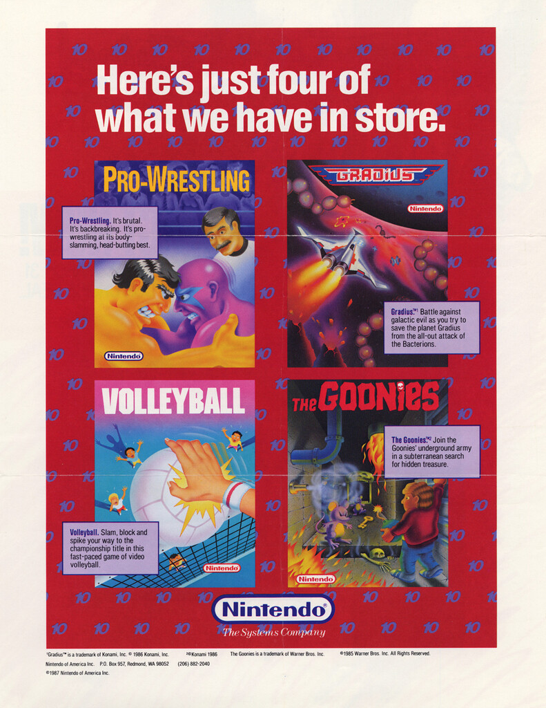 Mentions Pro-Wrestling, Gradius, Volleyball and The Goonies