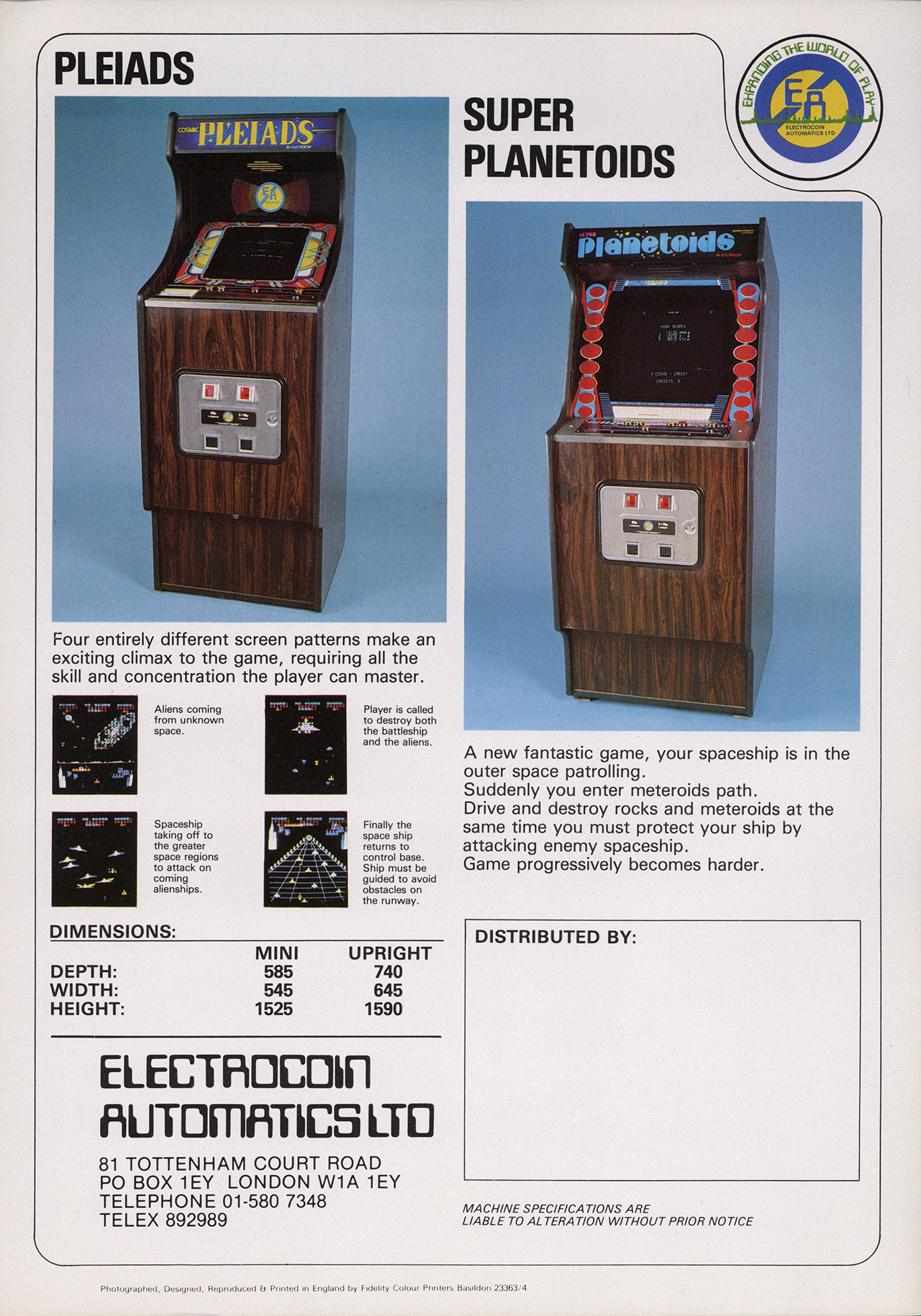 Pleiads/Super Planetoids UncategorizedApril 2023July 2023 Dan Hower Year Released 1979-1980 Developed by Tehkan , Atari Published by Electrocoin More Information 1 Page Flyer Also known as Pleiades by Tehkan and Asteroids by Atari Printed Text English Paper Size A4 Date Posted Apr 8, 2023 Views 0